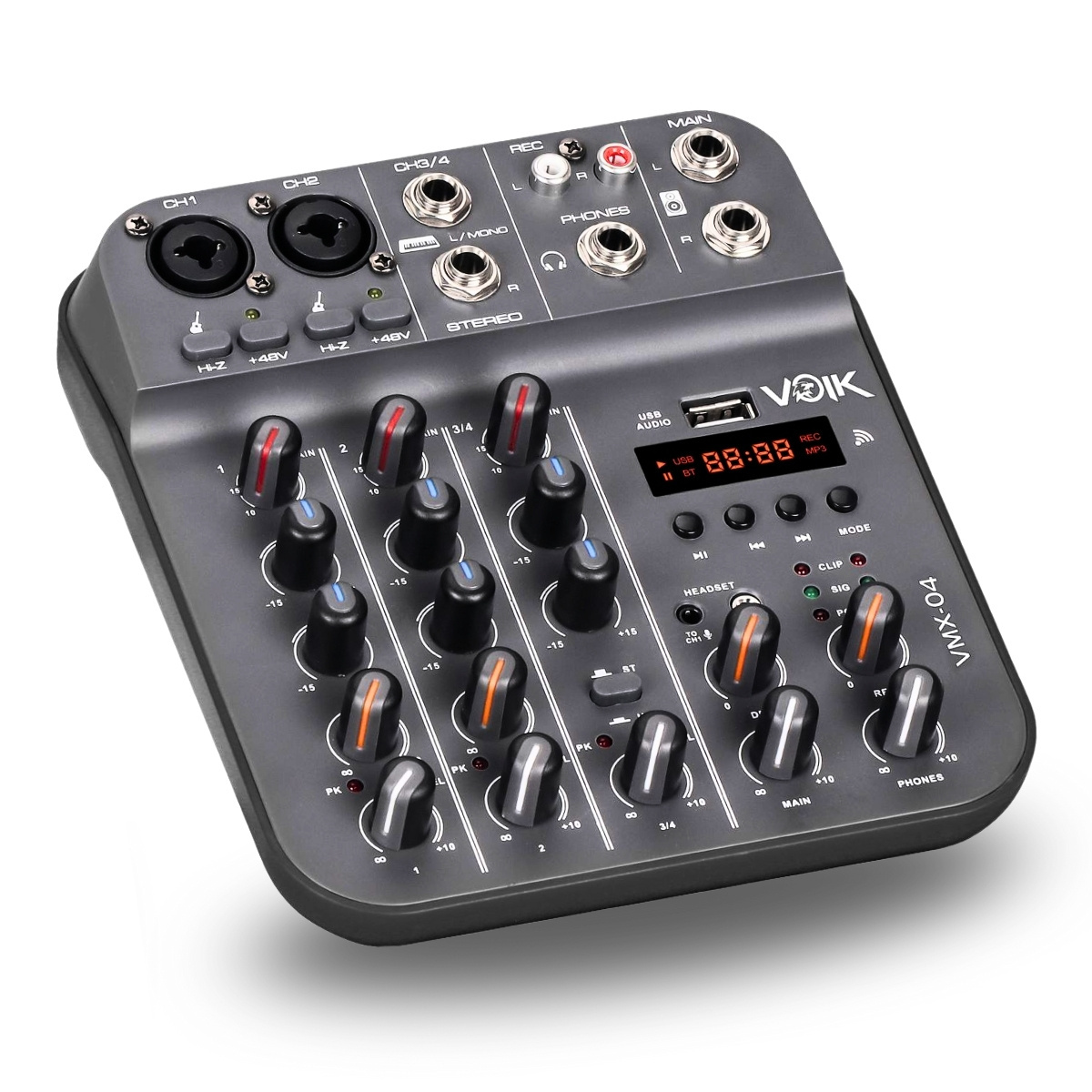 A Mesa de Som Interface 4 Canais Voik VMX-04 entrega versatilidade profissional em um formato compacto, unindo mixer analógico, interface USB-C, Bluetooth e MP3 Player em um único equipamento. Ela permite gravar diretamente no computador com alta qualidade, enquanto o Bluetooth garante reprodução sem fio para bases e trilhas. As entradas Combo com Phantom Power +48V e Hi-Z individual proporcionam compatibilidade total com microfones condensadores, guitarras e baixos, sem necessidade de equipamentos extras. O EQ de 2 bandas e o efeito Delay ajustável enriquecem vocais e instrumentos com mais profundidade e presença. Além disso, sua alimentação 5V via USB-C permite uso móvel com power bank, ideal para gravações, lives e performances externas com praticidade e controle total do áudio.